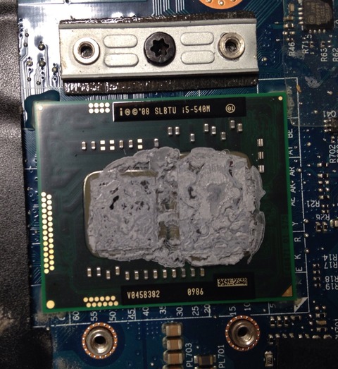 CPUクーラーをとりました。CPUグリスは完全に乾いていてチップセットのグリスと共に役目を果たしてない状態です。