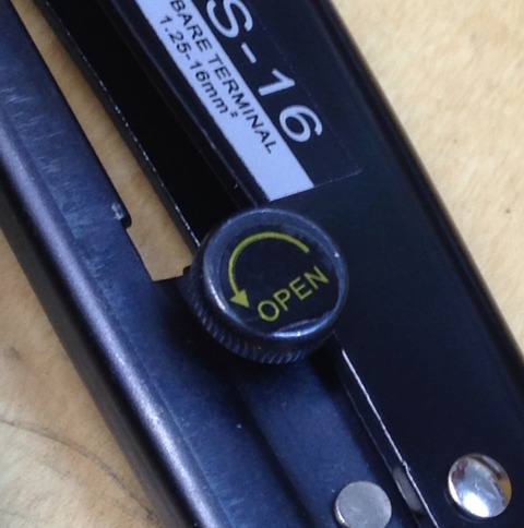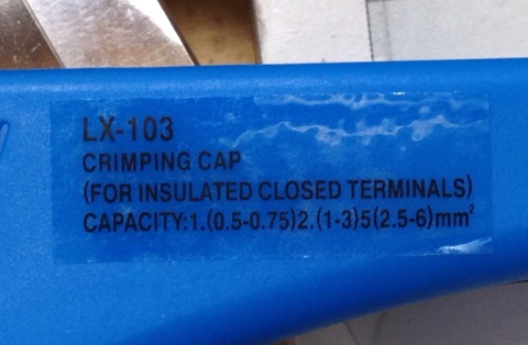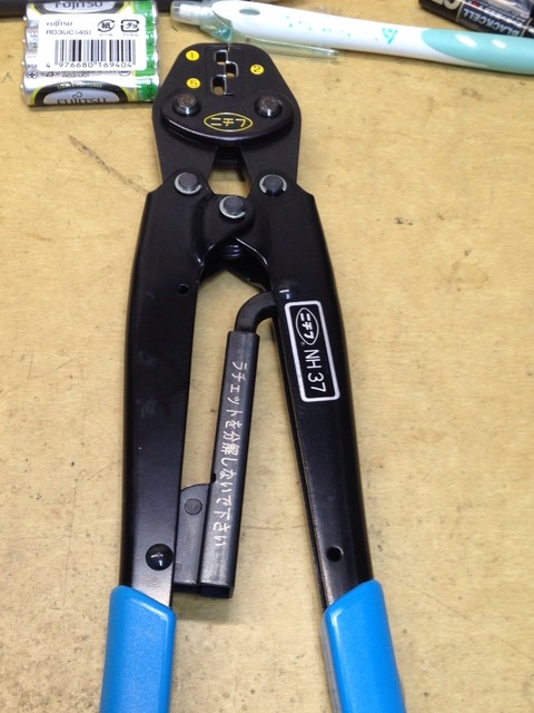青グリップが眩しいニチフ純正圧着工具。JISマークは当然ありません。