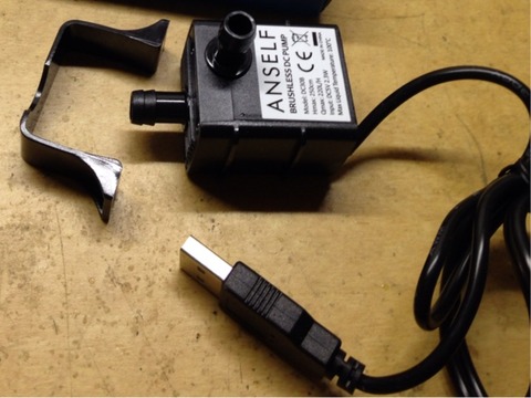 そして水冷の心臓部、ポンプです。USBで2.5Wほどの出力があります。全揚程2.2mと結構圧力あります。
