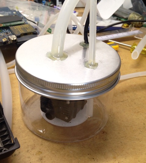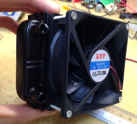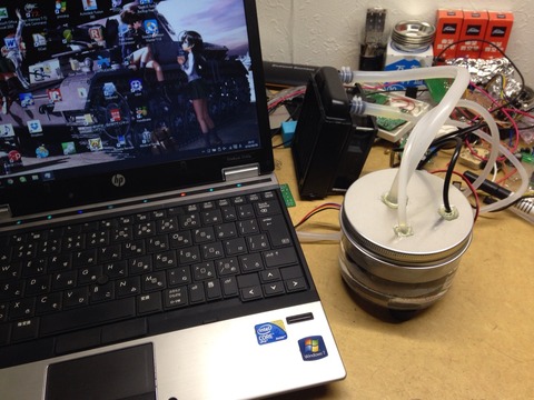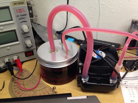 そこで自動車用ラジエーターのクーラントを入れてみたのですがどうもあまり冷えない。粘度が水よりも少し高いせいであまり循環しなくなっていた。クーラントを水割りにしよう。