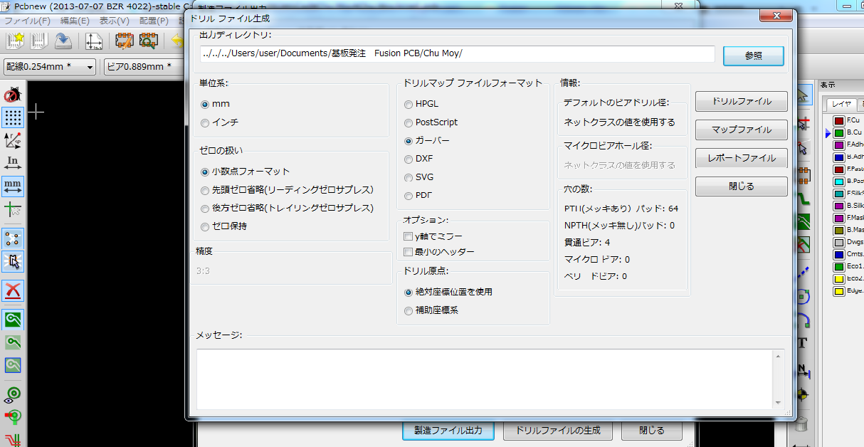 製造ファイル出力の隣にあるドリルファイル出力を押してドリルファイルも出力しましょう。