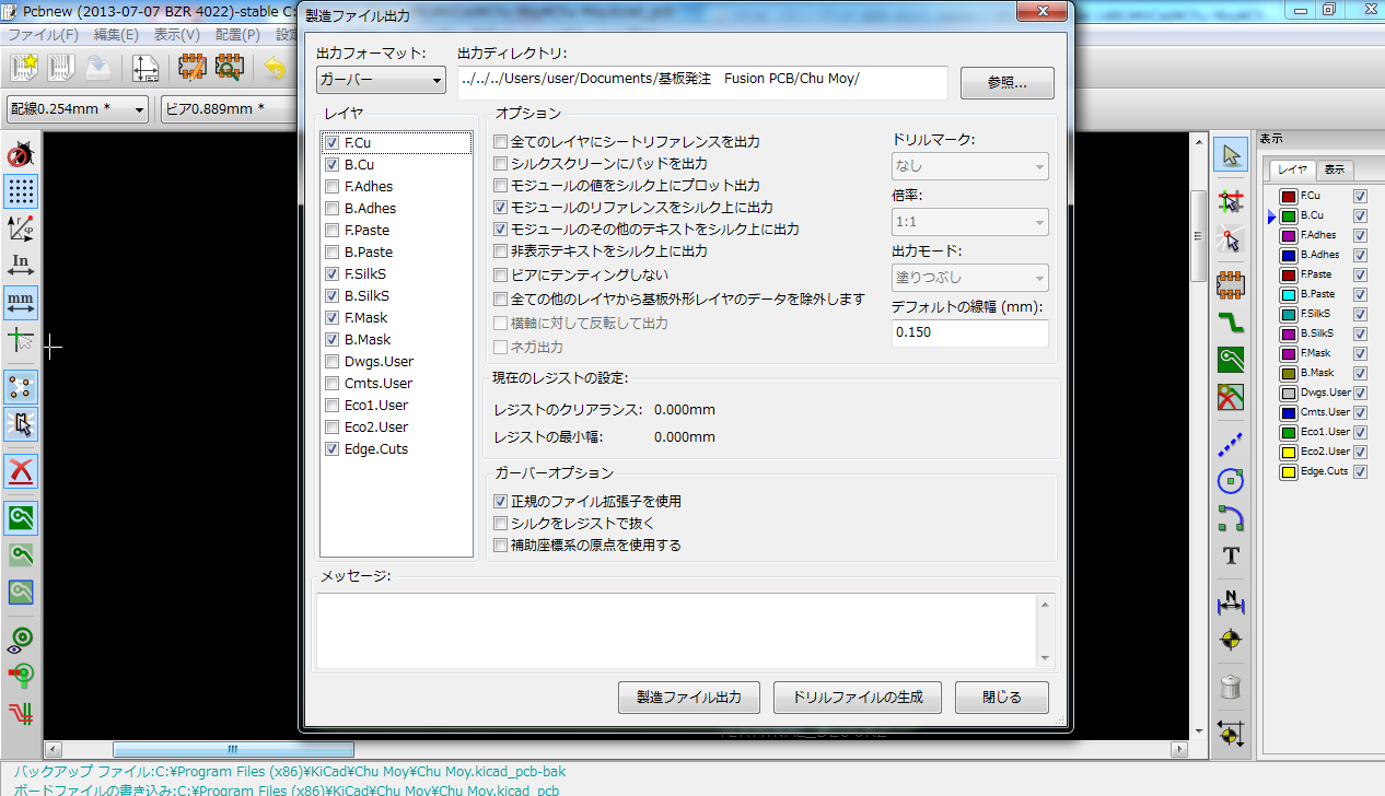 ガーバーデータが出力されるので好きなディレクトリに保存しましょう。レイヤはチェックマークのあるところのみ出力すれば問題ないです。